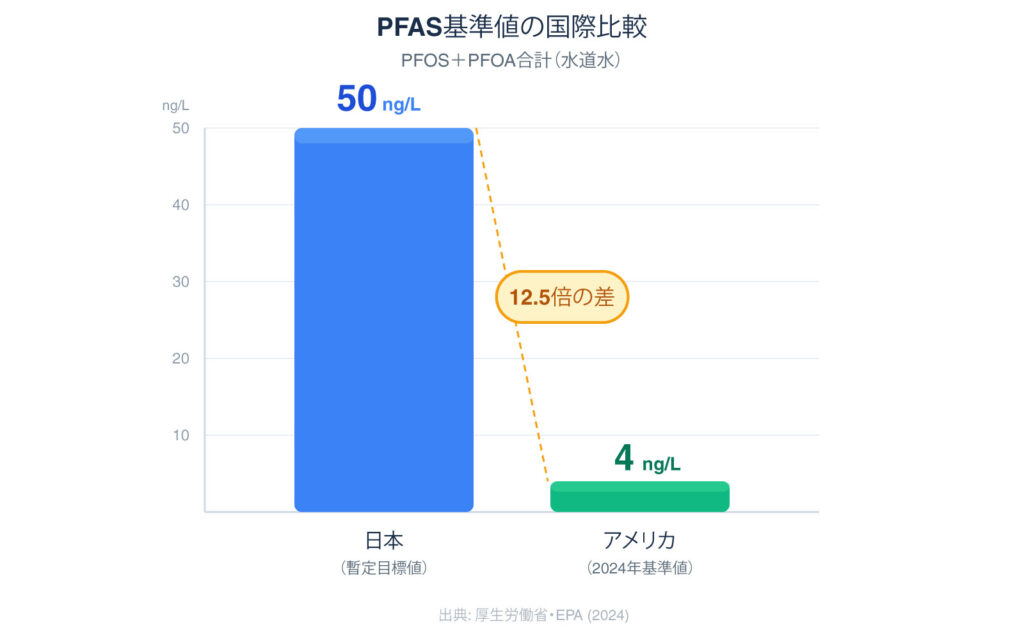 アメリカでは2024年、米国環境保護庁(EPA)がより厳しい基準として4ng/Lを設定しました。日本の基準値(50ng/L)と比べると、実に12.5倍の差があります。さらにEUでは、個々のPFAS物質ごとに規制が設けられており、合計でより低い基準が適用されています。
